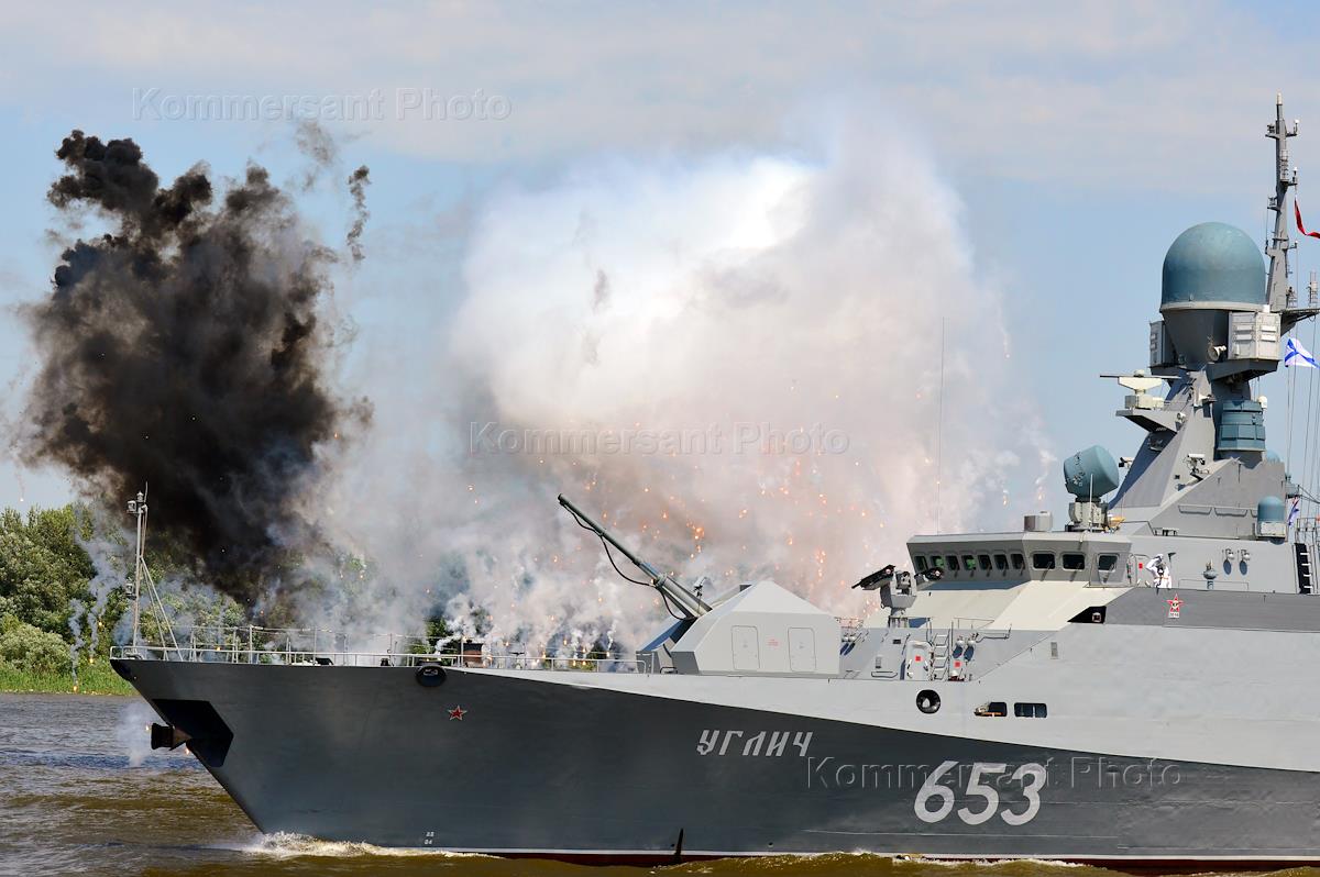 Военно-морской парад в честь Дня военно-морского флота (ВМФ) России в Астрахани. Малый ракетный корабль "Углич" Каспийской флотилии во время парада.