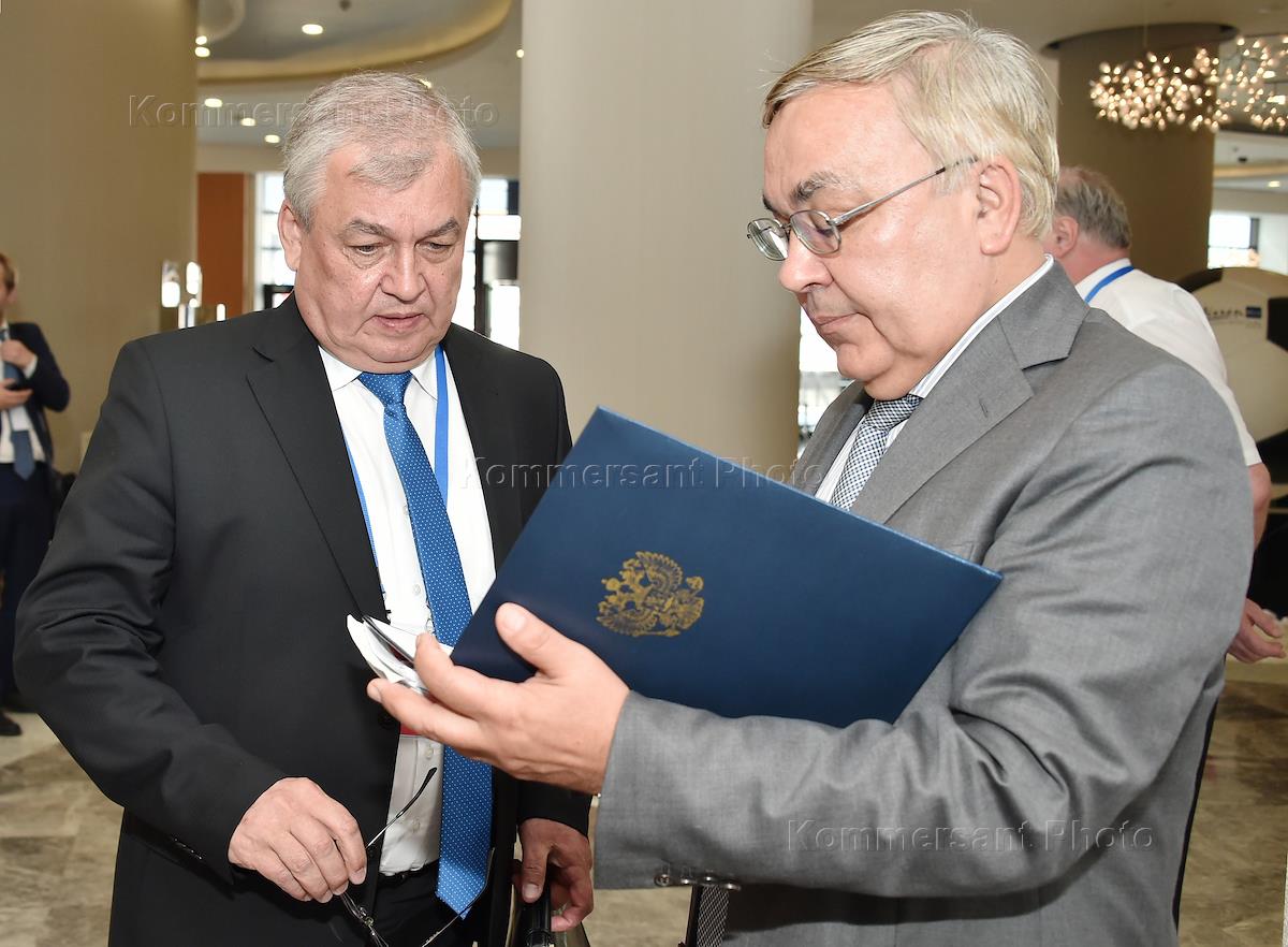 Конгресс сирийского национального диалога в Сочи. Десятая Международная встреча астанинского формата по Сирии в гостинице "Рэдиссон Блю Резорт". Специальный представитель президента России по сирийскому урегулированию Александр Лаврентьев (в центре) и представитель Генерального штаба Вооруженных Сил России Ярослав Москалик (справа) перед началом встречи.