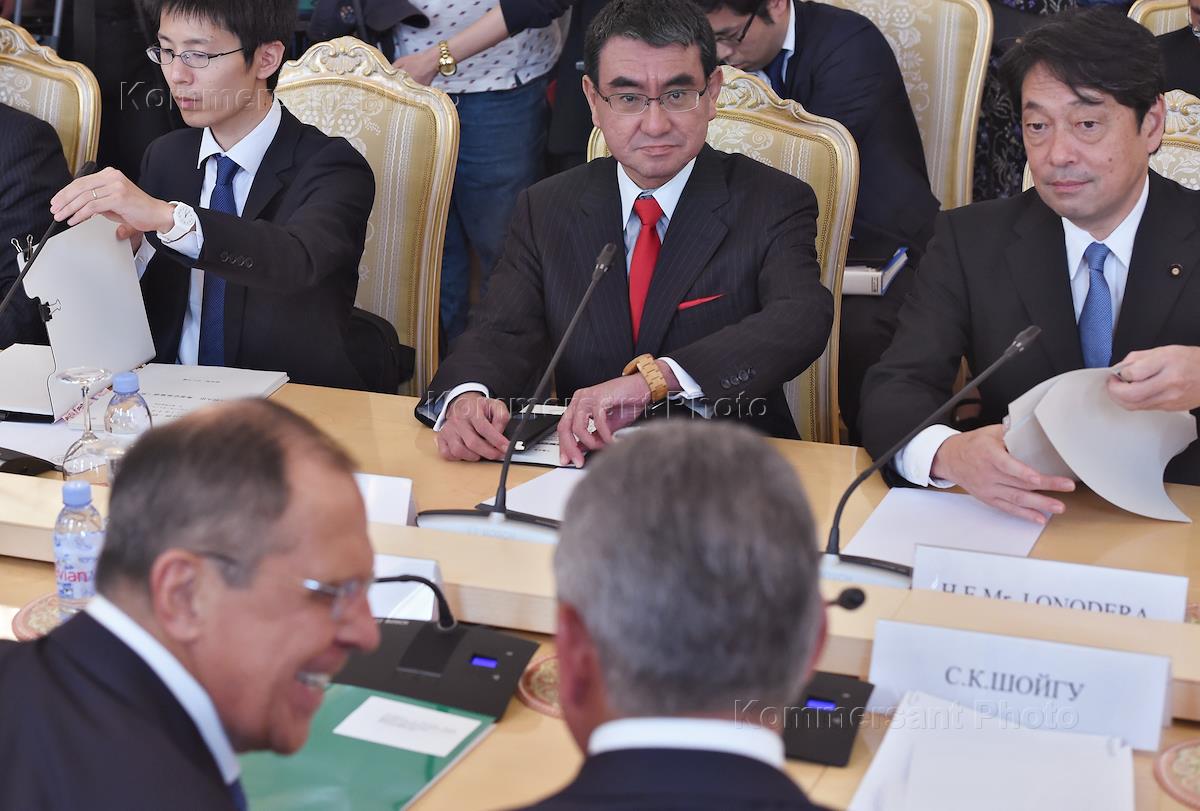 Министр иностранных дел Японии Таро Коно (в центре) и министр обороны Японии Ицунори Онодэра (справа) во время встречи с министром обороны России Сергеем Шойгу и министром иностранных дел России Сергеем Лавровым встречи в Доме приемов МИД России.