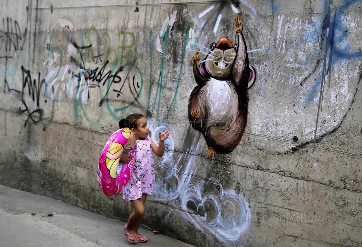 Жанровая фотография. Девочка с надувным кругом идет вдоль бетонной стены с нарисованной мышкой.