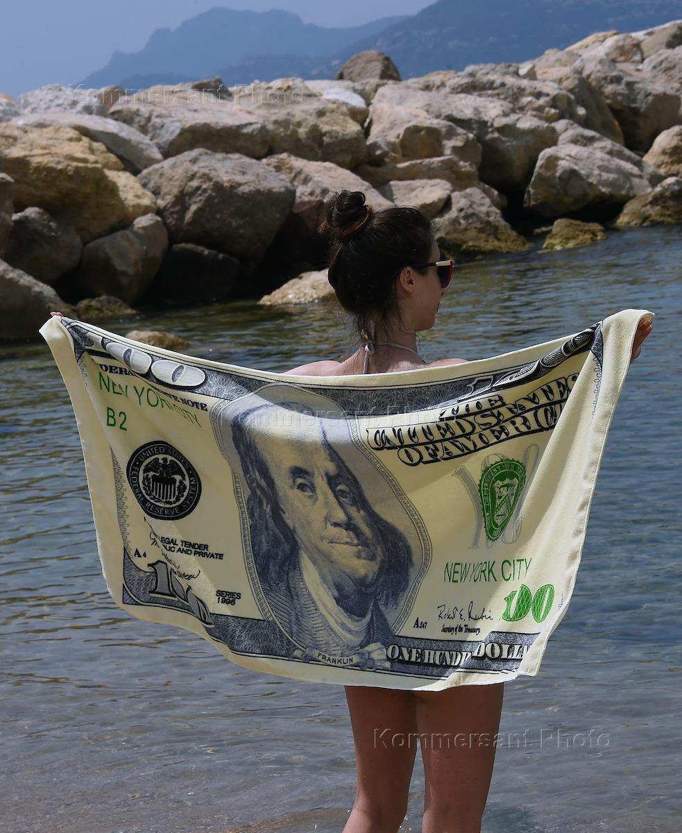 Жанровая фотография. Отдыхающие на пляже в Каннах. Девушка с полотенцем с рисунком американской 100-долларовой купбры на пляже у моря.