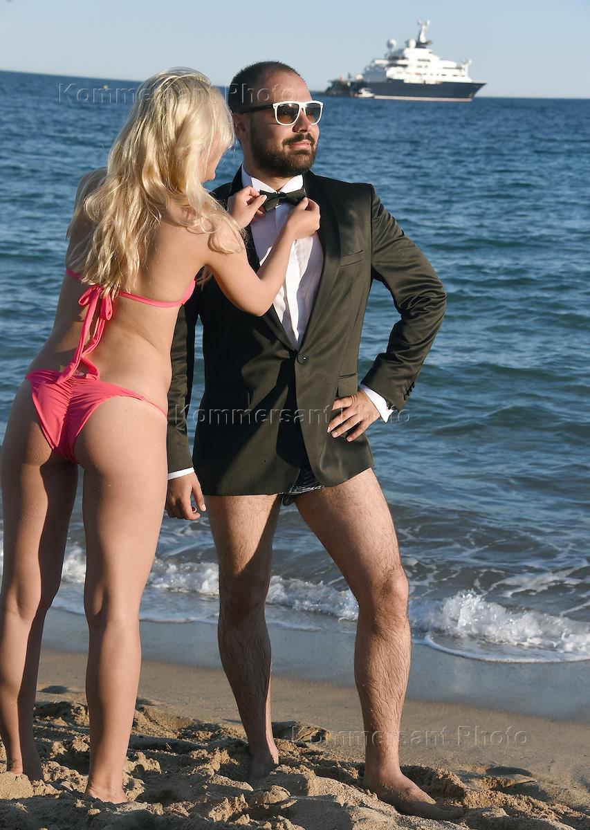 Жанровая фотография. Отдыхающие на пляже в Каннах. Девушка с полотенцем с рисунком американской 100-долларовой купбры на пляже у моря.