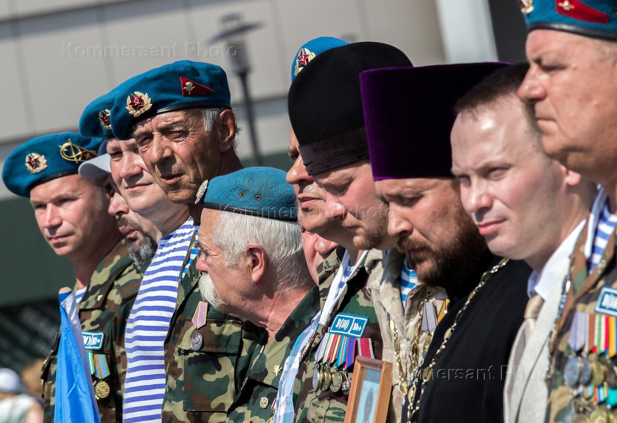 Celebration of Russian Airborne forces Day in Park Gorkogo. Former Airbone forces near the eternal flame.