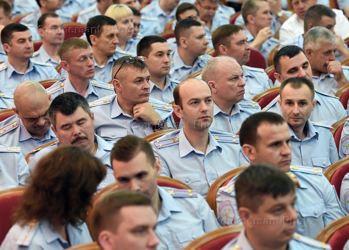 Расширенное заседание коллегии ГУ МВД России по Москве "Итоги оперативно-служебной деятельности подразделений системы ГУ МВД России по Москве за первое полугодие 2018 года и задачи по укреплению правопорядка, дисциплины и законности на предстоящий период" прошло в Главном управлении МВД России по Москве. Начальник ГУ МВД России по Москве Олег Баранов (в центре) во время заседания.