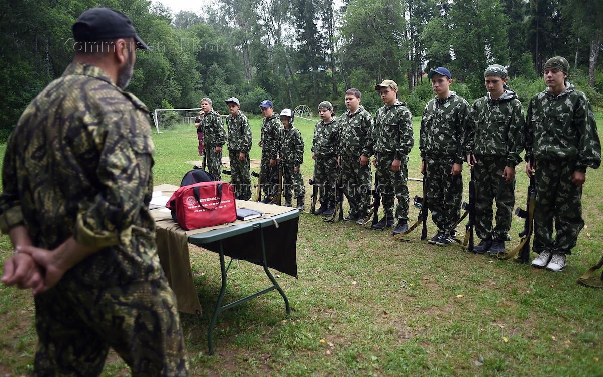Военно-патриотический лагерь в деревне Ширяево. Занятия с огнестрельным оружием для воспитанников лагеря на полигоне.