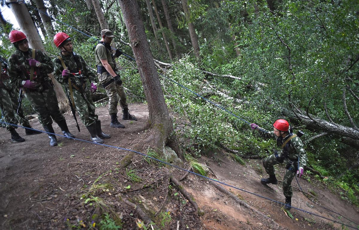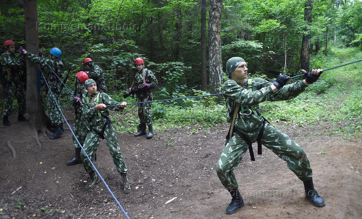 Военно-патриотический лагерь в деревне Ширяево. Воспитанники лагеря во время занятий по скалолазанию.