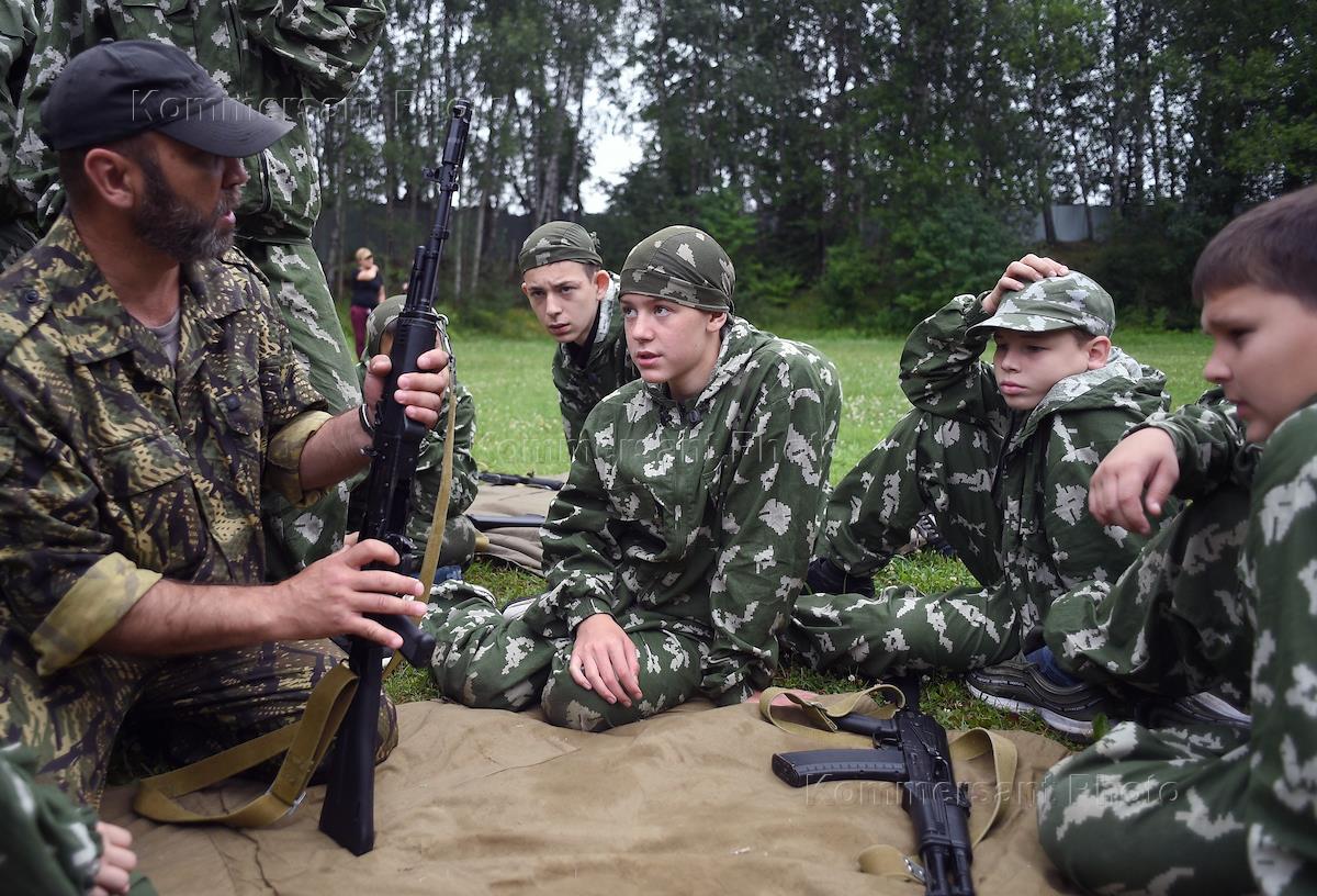 Военно-патриотический лагерь в деревне Ширяево. Занятия с огнестрельным оружием для воспитанников лагеря на полигоне.