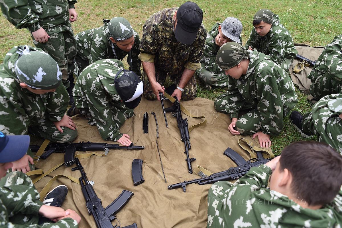 Военно-патриотический лагерь в деревне Ширяево. Занятия с огнестрельным оружием для воспитанников лагеря на полигоне. Разборка и сборка автомата Калашникова.