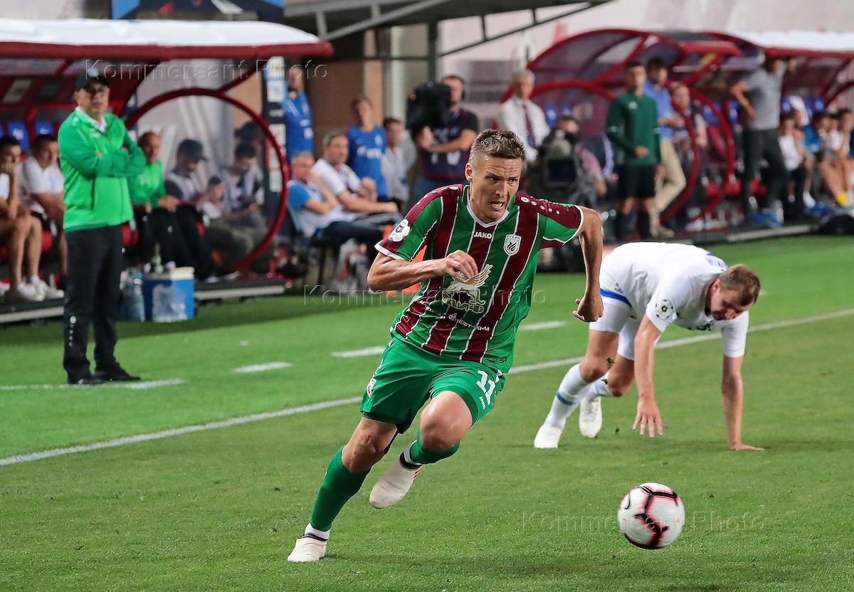 РПЛ. Чемпионат России по футболу 2018/2019. 2 тур. Матч между командами "Динамо" (Москва) и "Рубин" (Казань) на стадионе "Арена Химки". Игрок команды "Рубин" Дмитрий Полоз (в центре) во время матча.