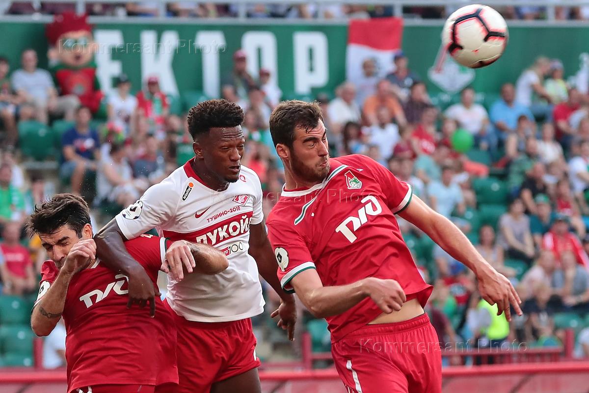 РПЛ. Чемпионат России по футболу 2018/2019. 2 тур. Матч между командами "Локомотив" (Москва) и "Спартак" (Москва) на стадионе "РЖД Арена". Мгроки команды "Локомотив" Ведран Чорлука (слева), Соломон Кверквелия (справа) и игрок команды "Спартак" Зе Луиш (в центре) во время матча.