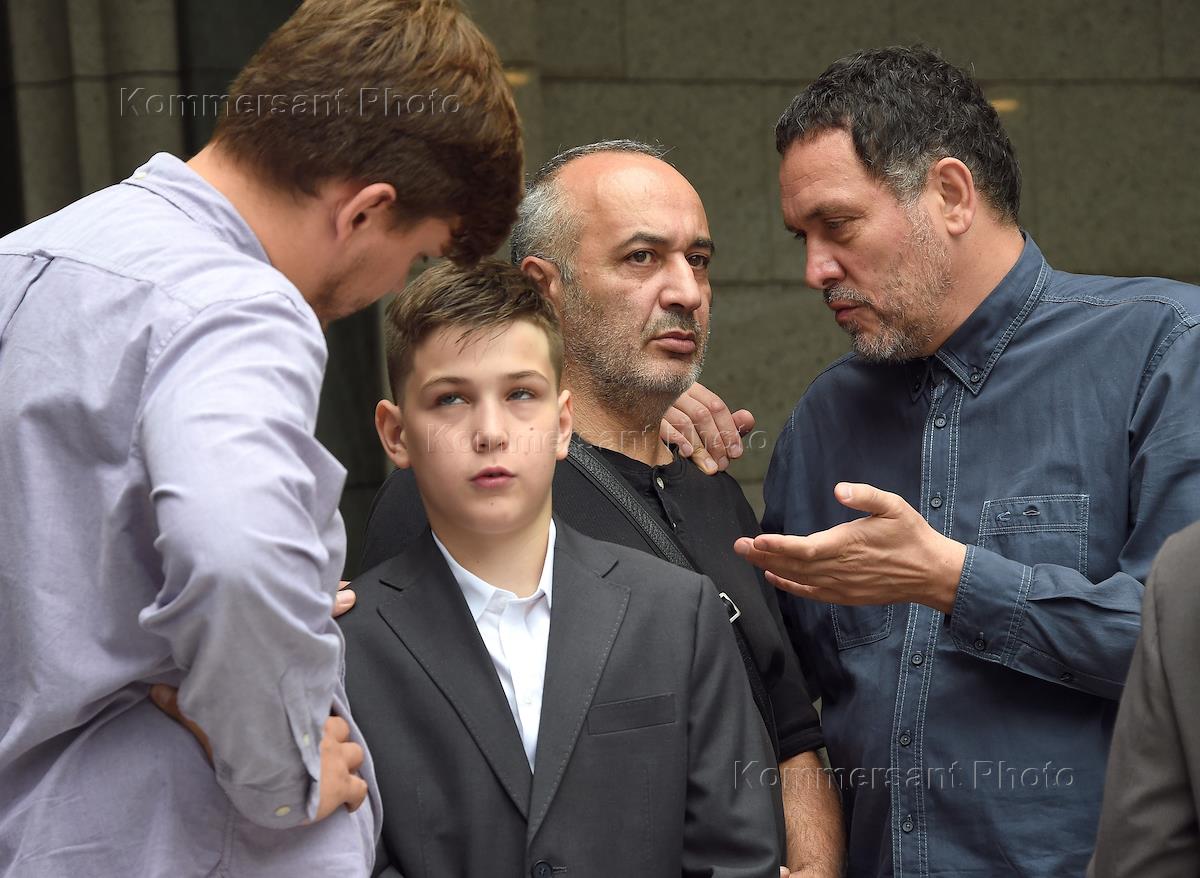Farewell ceremony of Russian journalist Orkhan Dzhemal who was killed in Central African Republic in Moscow Cathedral Mosque. Journalist Maxim Shevchenko (right) and Orkhan Dzhemal's son Mansur (second left) before the ceremony.