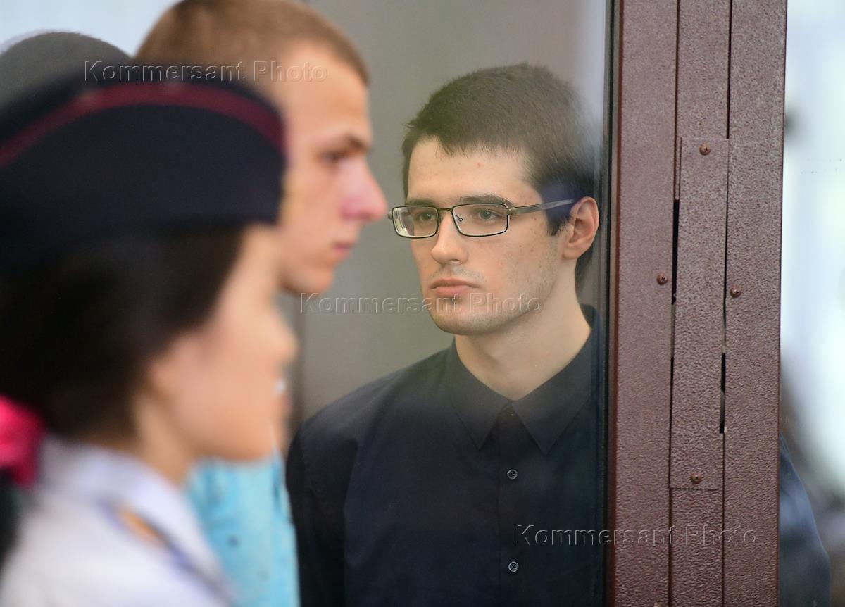 Обвиняемый по делу о предполагаемом подрыве Казанского собора в Санкт-Петербурге Евгений Ефимов (слева) во время заседания Ленинградского окружного военного суда.