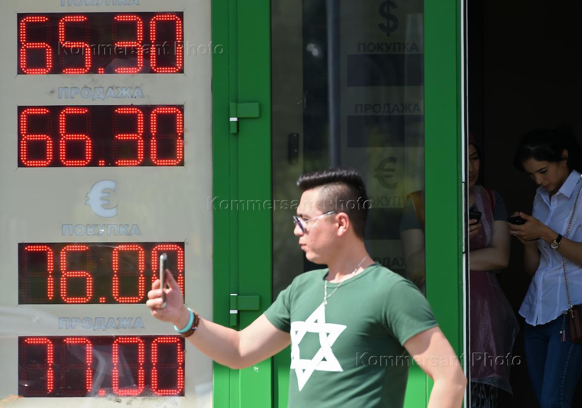 Жанровая фотография. Электронное табло пункта обмена валют с курсом американского доллара и евро.