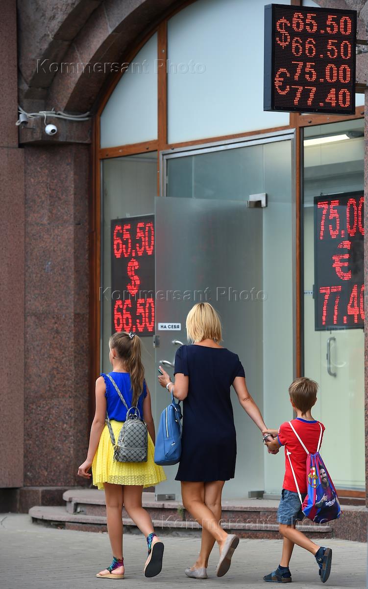Жанровая фотография. Женщина с детьми проходит мимо пункта обмена валют.