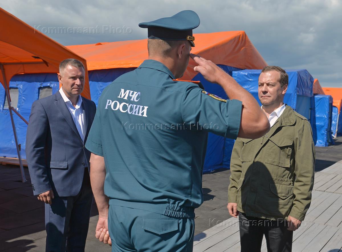 Russian Prime minister Dmitry Medvedev work trip to Kamchatka Krai. Russian prime minister Dmitry Medvedev (right) during the Ministry of Emergency Situations inspection.