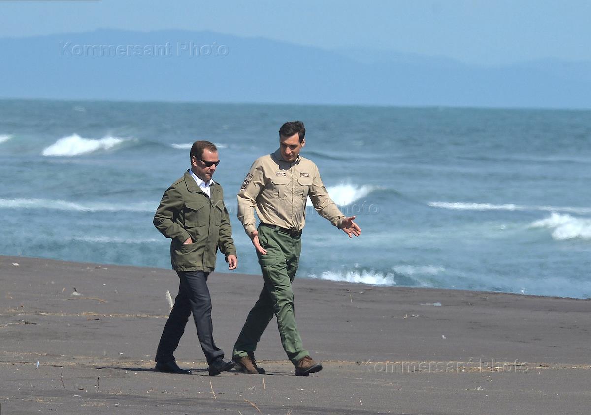 Russian Prime minister Dmitry Medvedev work trip to Kamchatka Krai. Russian prime minister Dmitry Medvedev (left) and Chief of Kronotskiy nature reserve Petr Shpilenok (right) before the meeting with Kronotskiy nature reserve employees.