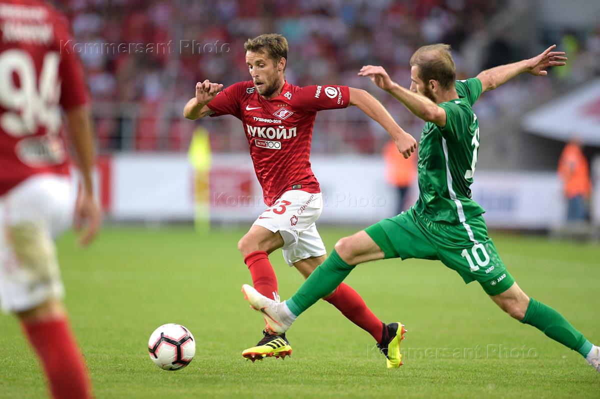РПЛ. Чемпионат России по футболу 2018/2019. 4 тур. Матч между командами "Спартак" (Москва) и "Анжи" (Махачкала) прошел на стадионе "Открытие Арена". Игрок команды "Спартак" Дмитрий Комбаров (второй справа) и игрок команды "Анжи" Адлан Кацаев (справа) во время матча.