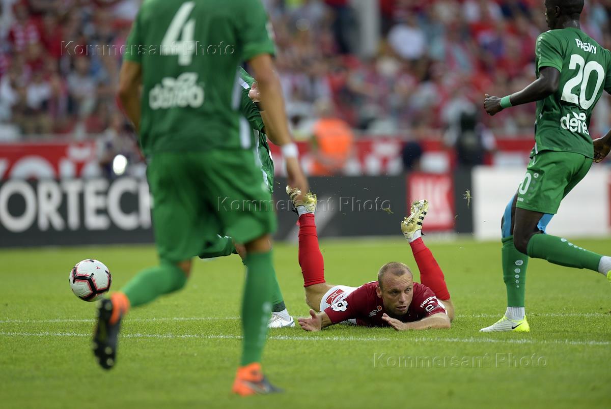 РПЛ. Чемпионат России по футболу 2018/2019. 4 тур. Матч между командами "Спартак" (Москва) и "Анжи" (Махачкала) прошел на стадионе "Открытие Арена". Игрок команды "Спартак" Александр Ташаев (слева) и игрок команды "Анжи" Иван Маркелов (в центре) во время матча.