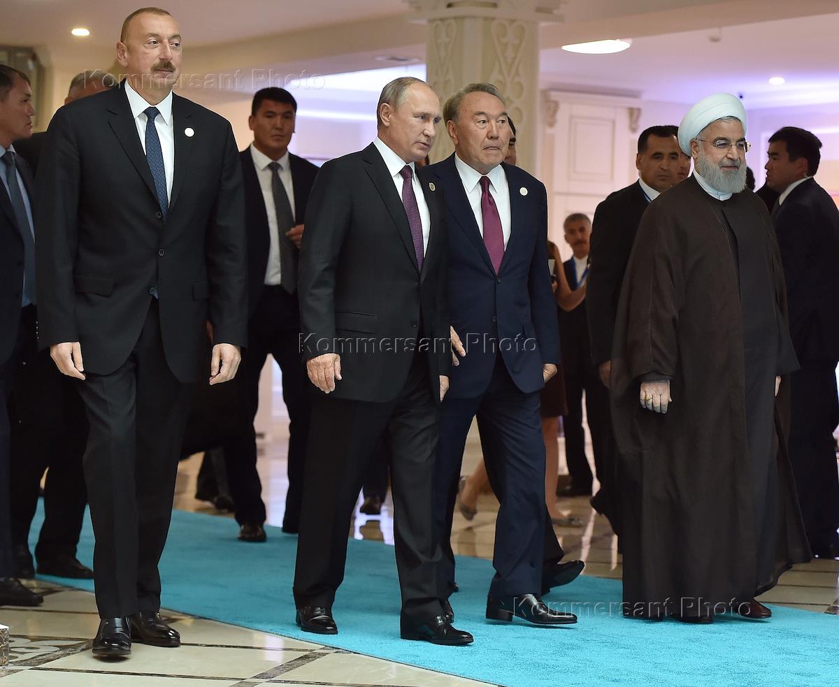 Russian president Vladimir Putin work trip to Kazakhstan. V Сaspian summit. From left to right: Azerbaijanian president Ilkham Aliev, Iranian president Hassah Rouhani, President of Kazakhstan Nursultan Nazarbayev, President of Russia Vladimir Putin and President of Turkmenistan Gurbanguly Berdimuhamedow after the signing ceremony in Druzhba palace in Aktau.