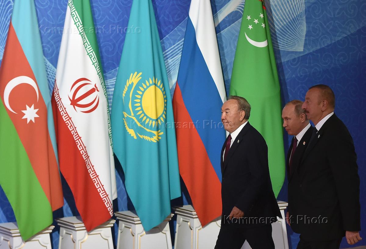 Working visit of Russian president Vladimir Putin to Kazakhstan. Vth Сaspian summit. Left to right: President of Kazakhstan Nursultan Nazarbayev, President of Russia Vladimir Putin and President of Azerbaijan Ilham Aliyev after the ceremony of signing the Convention on the Legal Status of the Caspian Sea following the meeting of the heads of State participating in the Summit in Druzhba palace.