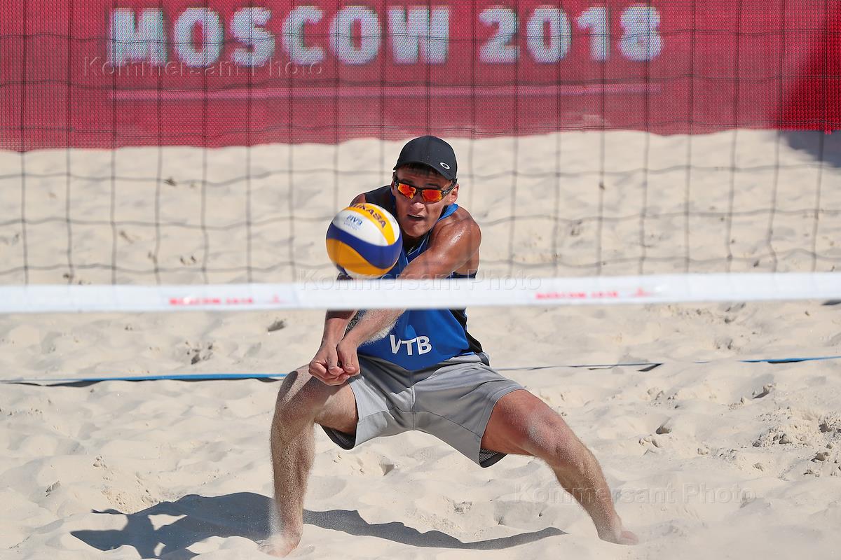 Мировой тур по пляжному волейболу категории 4 звезды прошел в Парке Горького. Российский волейболист Олег Стояновский во время матча за 3-е место с командой Катара.