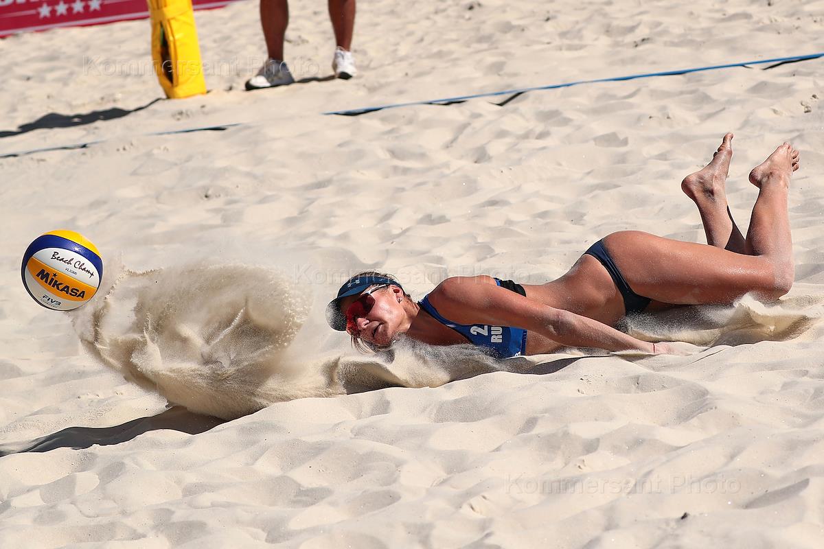 Мировой тур по пляжному волейболу категории 4 звезды прошел в Парке Горького. Мировой тур по пляжному волейболу категории 4 звезды. Российский волейболистки Надежда Мокрогузова (слева) и Светлана Холомина (справа) во время матча с командой Германии.