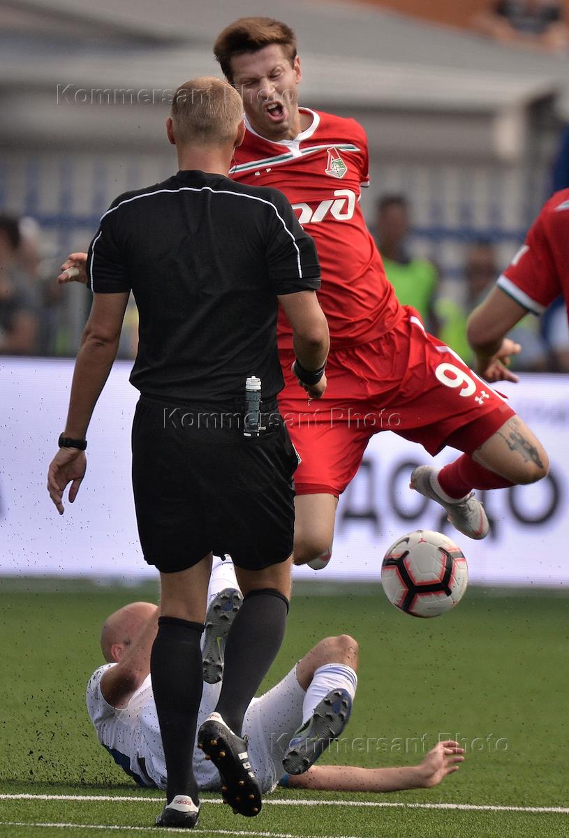 РПЛ. Чемпионат России по футболу 2018/2019. 3 тур. Матч между командами "Оренбург" (Оренбург) и "Локомотив" (Москва) прошел на стадионе "Газовик". Игрок команды "Локомотив" Федор Смолов (справа) и игрок команды "Оренбург" Силвие Бегич (в центре) во время матча.