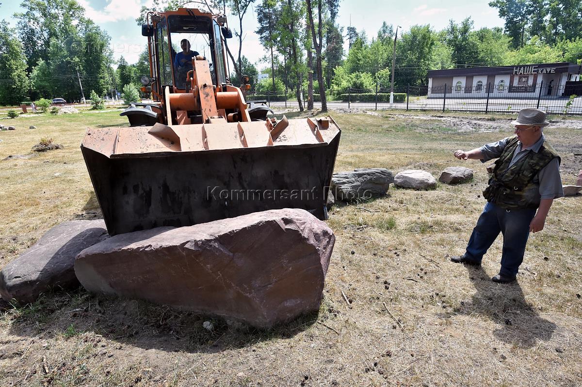 Город Рошаль. Строительство мегалитического комплекса в парке города. Разгрузка камня из ковша трактора.