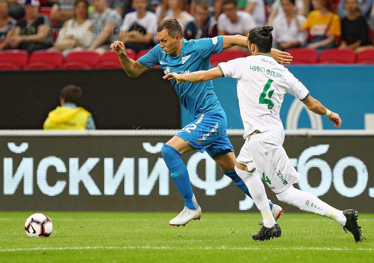 Российская Премьер-лига (РПЛ). Чемпионат России по футболу 2018/2019. 3-й тур. Матч между командами ФК "Рубин" (Казань) и ФК "Зенит" (Санкт-Петербург) на стадионе "Казань Арена". Игрок команды "Зенит" Артем Дзюба (слева) и игрок команды "Рубин" Чико Флорес (справа) во время матча.