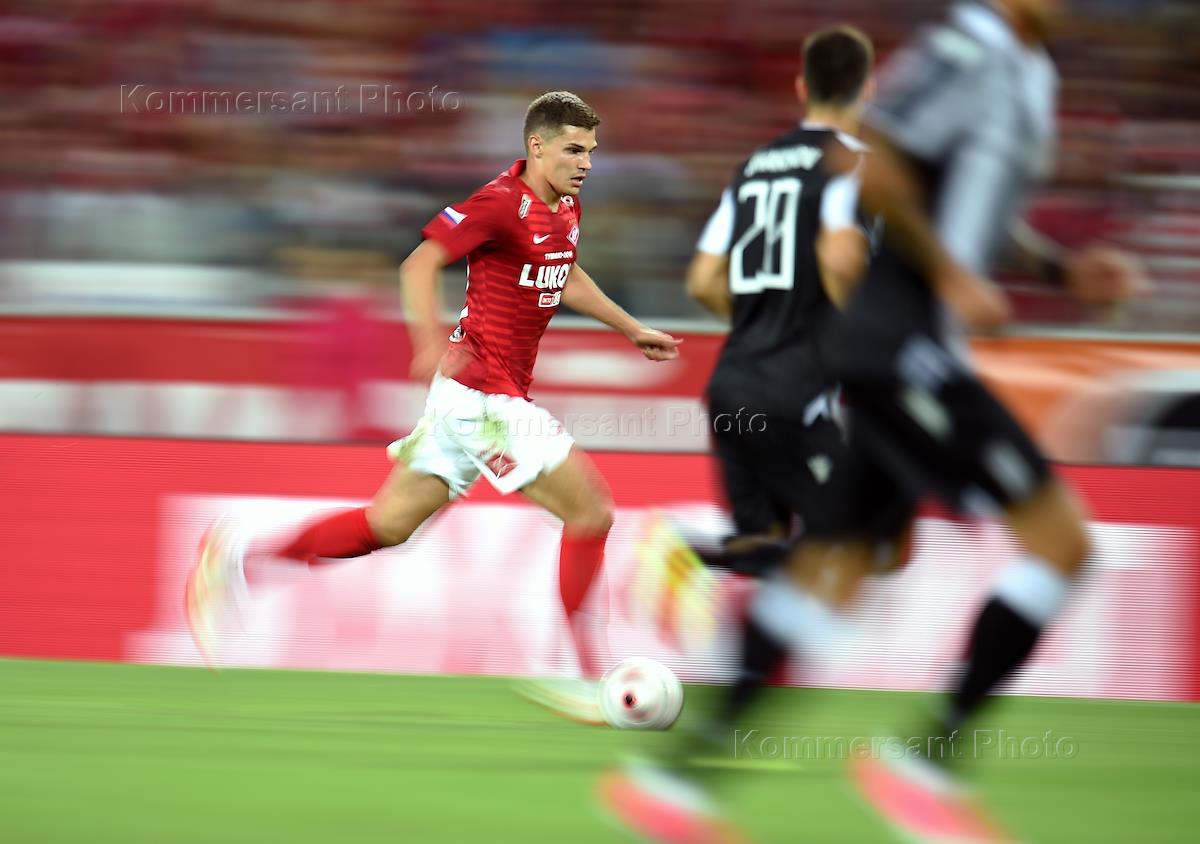 Лига чемпионов УЕФА по футболу. Матч между командами "Спартак" (Россия, Москва) - ПАОК (Греция, Салоники) прошел на стадионе "Открытие Арена". Игрок команды "Спартак" Роман Зобнин во время матча.