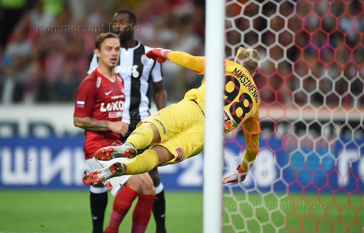 Лига чемпионов УЕФА по футболу. Матч между командами "Спартак" (Россия, Москва) - ПАОК (Греция, Салоники) прошел на стадионе "Открытие Арена". Вратарь команды "Спартак" Александр Максименко (справа) во время матча.