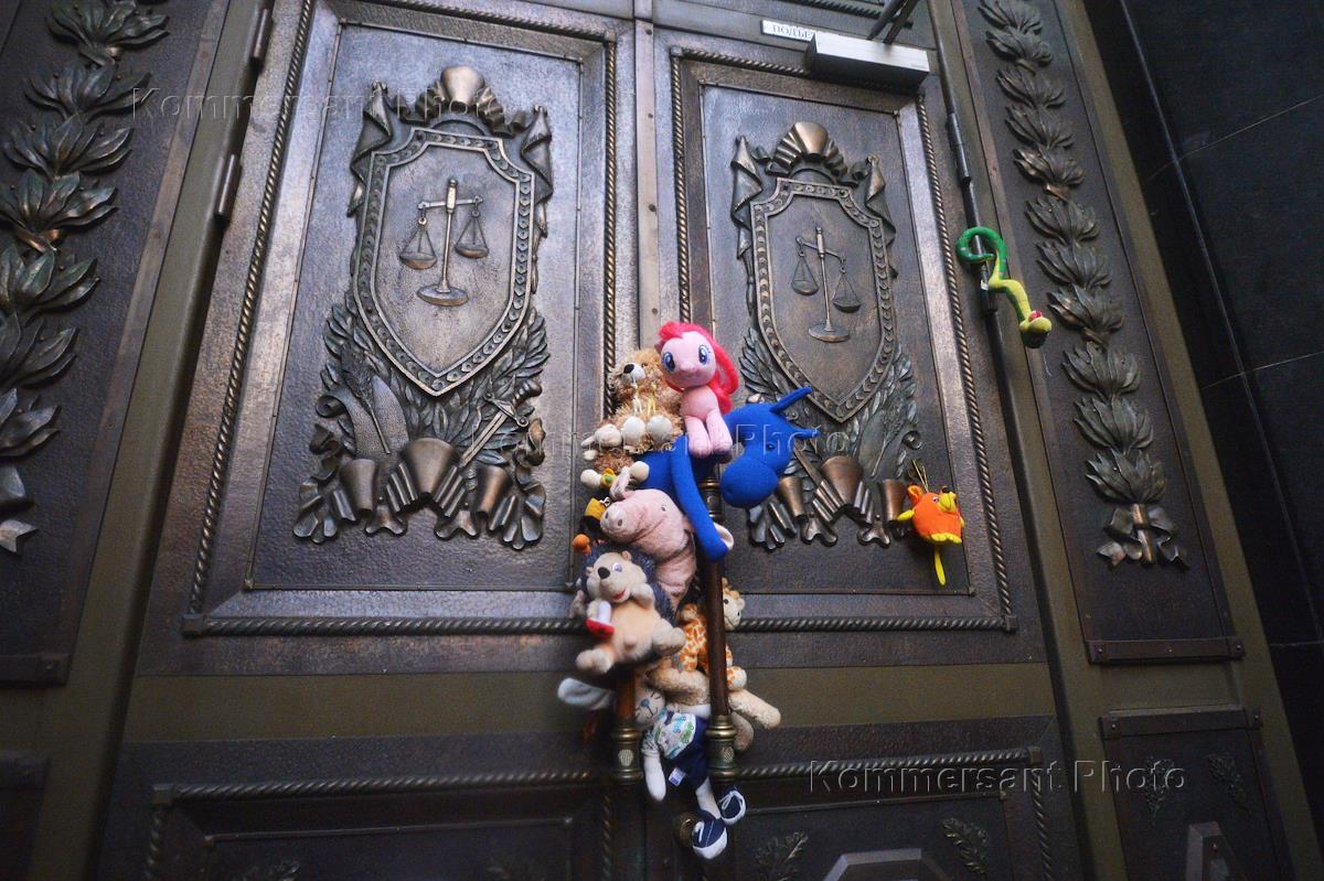Акция "Марш матерей" в защиту арестованных по делу "Нового величия". Игрушки, принесенные участниками акции, на входной двери приемной Верховного суда России.