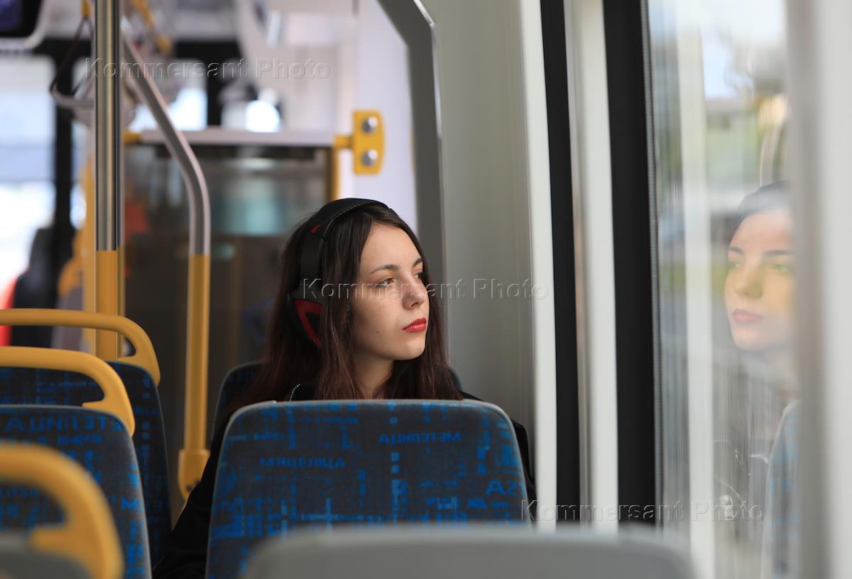 Трехсекционный двухкабинный трамвай B85300М "Метелица" производства компании "Штадлер Минск" на маршруте № 58 во время тестовой эксплуатации. Пассажиры во время движения трамвая.