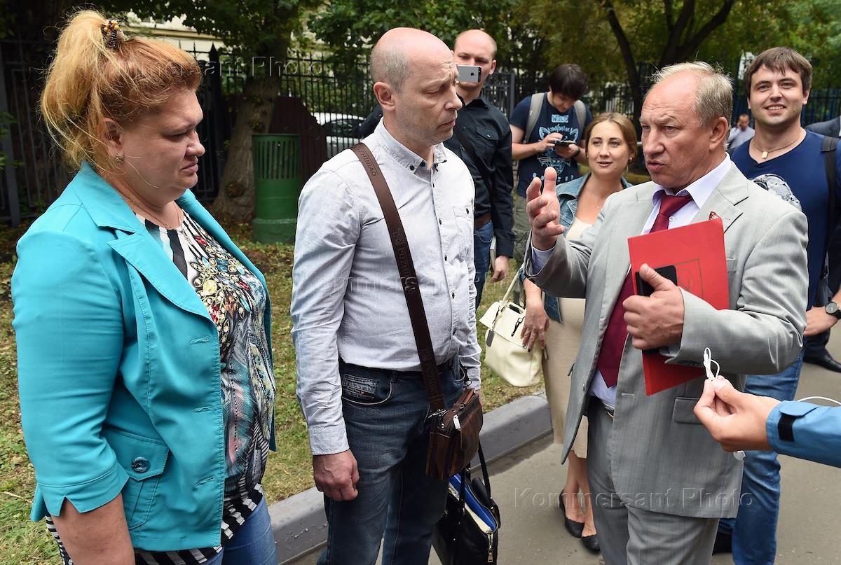 Рассмотрение ходатайства об изменении меры пресечения фигурантам дела организации "Новое величие" в Дорогомиловском суде. Слева направо: родители Марии Дубовик Наталья и Сергей и член комитета Государственной думы (ГД) России по Регламенту и организации работы Государственной думы Валерий Рашкин перед началом заседания у здания суда.