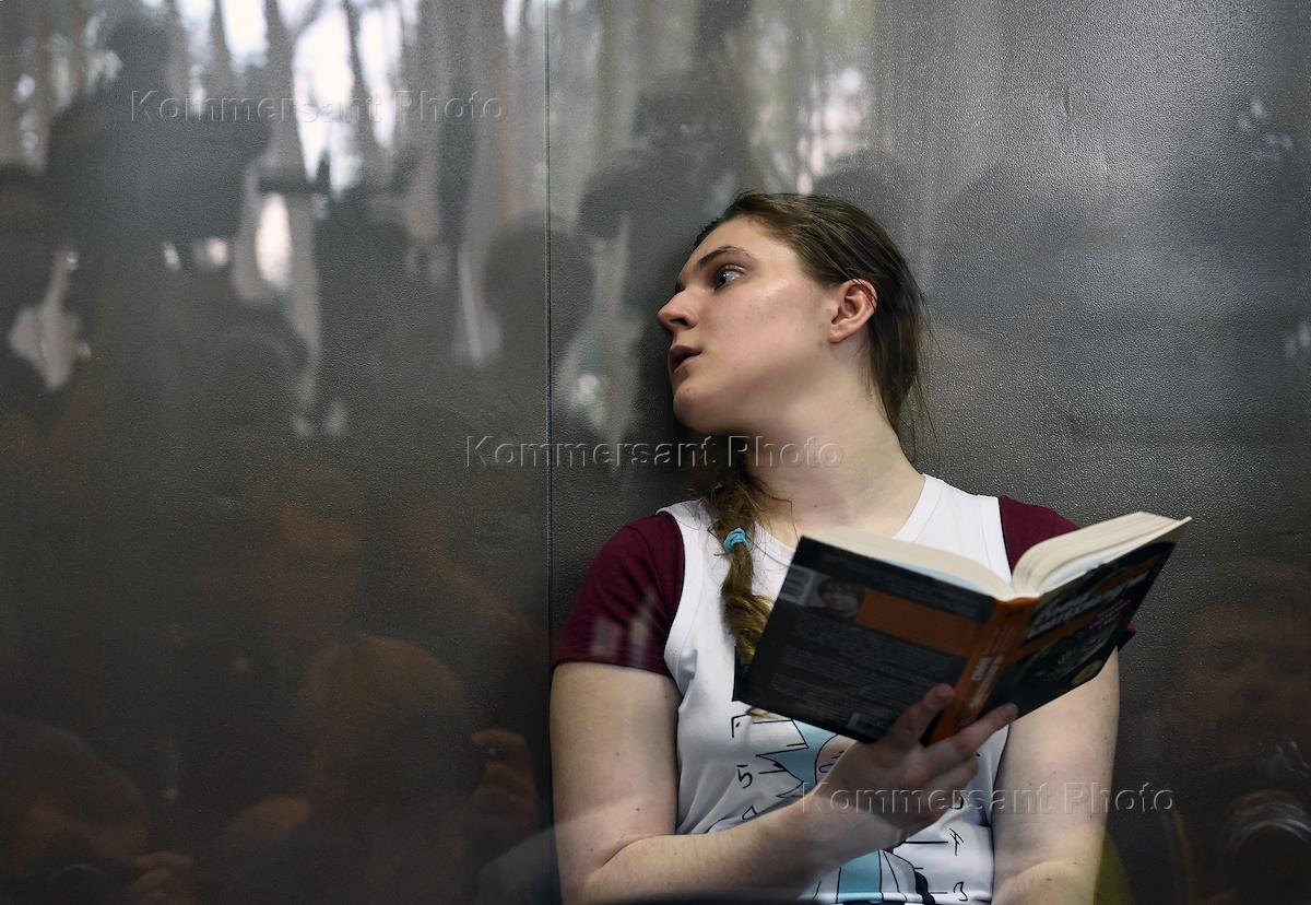 Обвиняемая в экстремизме участница движения "Новое величие" Анна Павликова (справа) во время заседания Дорогомиловского районного суда.