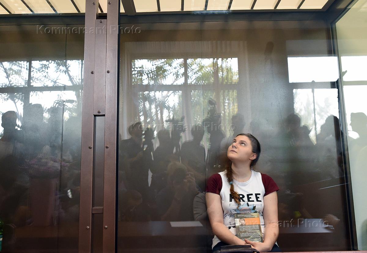 Обвиняемая в экстремизме участница движения "Новое величие" Анна Павликова (справа) во время заседания Дорогомиловского районного суда.