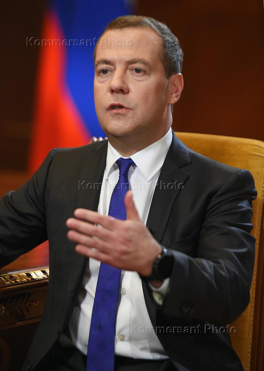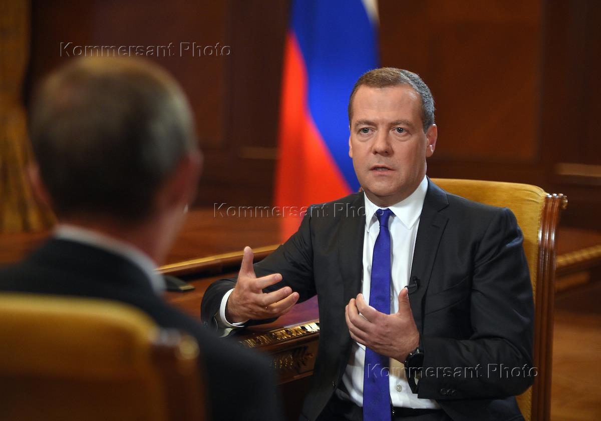 Председатель правительства России Дмитрий Медведев во время интервью.