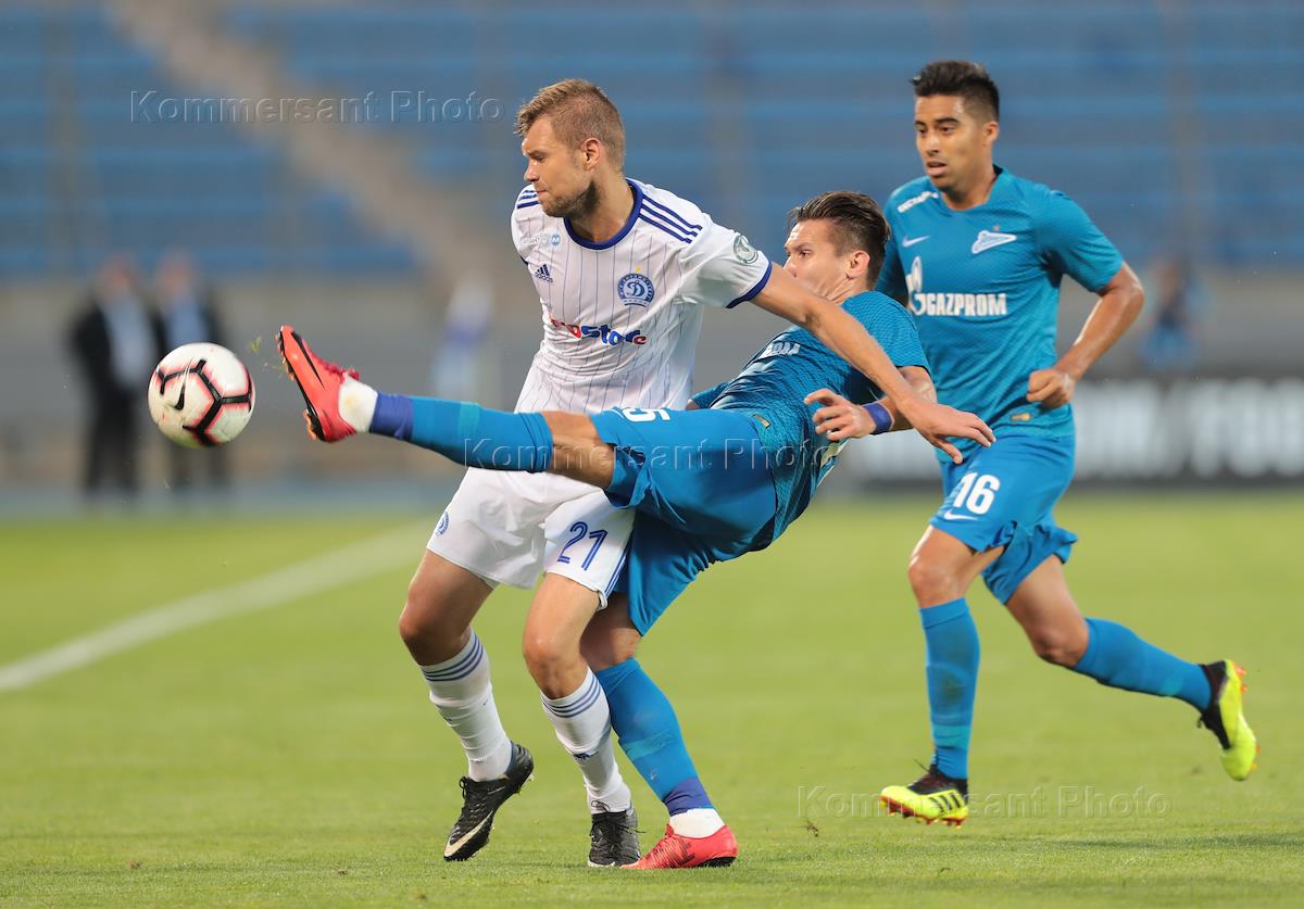 UEFA Europa league 2018/2019. Match between Zenit football club (Saint-Petersburg, Russia) and Dimano football club (Misnk, Belarus) at Petrovsky stadium. Zenit football player Artyom Dzuba (left) during the match.