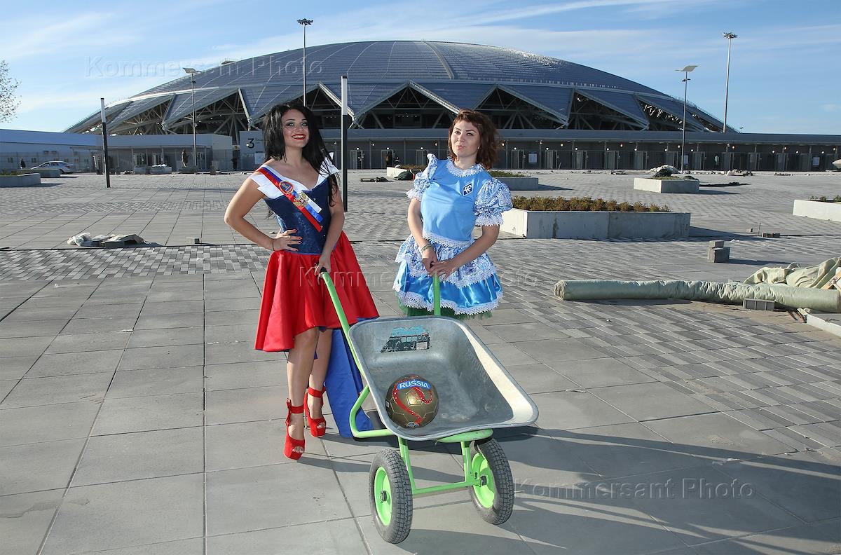 Фотопроект к Чемпионату Мира по Футболу 2018. Няня Елизавета Леванова и работник муниципального земельного контроля Марина Кузнецова на фоне стадиона "Самара Арена"