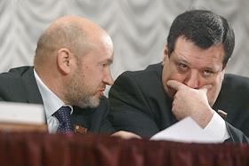 Председатель Московской городской думы Владимир Платонов (слева) и заместитель председателя Комитета Государственной Думы России по бюджету и налогам Андрей Макаров (справа) на ежегодной конференции адвокатов российской столицы в Центральном Доме архитекторов.