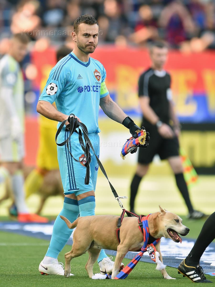 РПЛ. Чемпионат России по футболу 2018/2019. 4 тур. Матч между командами ЦСКА (Москва) и "Арсенал" (Тула) прошел на стадионе "ВЭБ Арена". Капитан команды ЦСКА Игорь Акинфеев с собакой из приюта для бездомных животных перед началом матча.