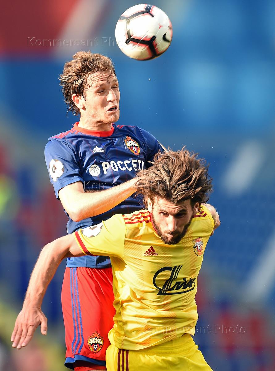 РПЛ. Чемпионат России по футболу 2018/2019. 4 тур. Матч между командами ЦСКА (Москва) и "Арсенал" (Тула) прошел на стадионе "ВЭБ Арена". Игрок команды ЦСКА Хёрдур Магнуссон (слева) во время матча.