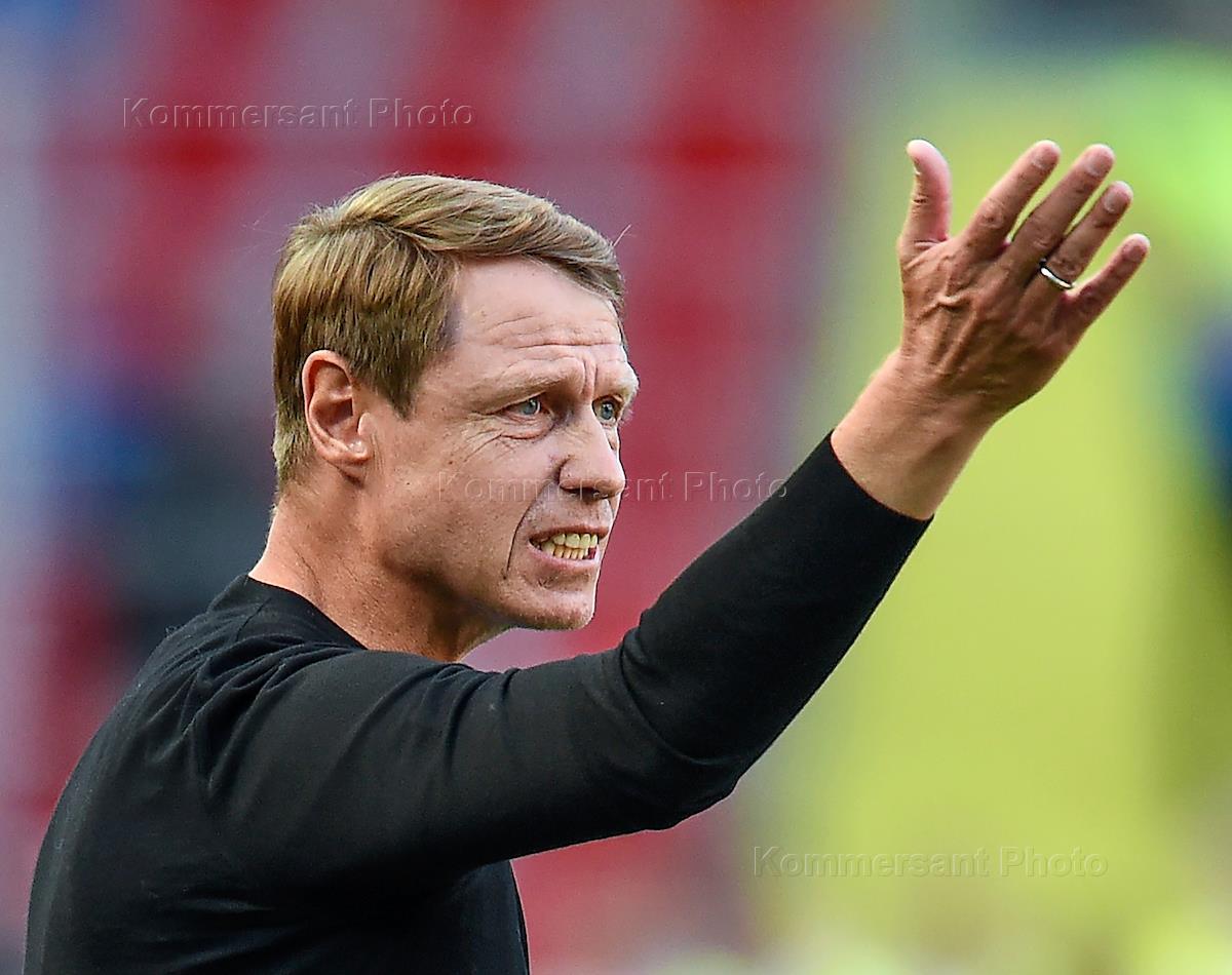 РПЛ. Чемпионат России по футболу 2018/2019. 4 тур. Матч между командами ЦСКА (Москва) и "Арсенал" (Тула) прошел на стадионе "ВЭБ Арена". Главный тренер команды "Арсенал" Олег Кононов во время матча.