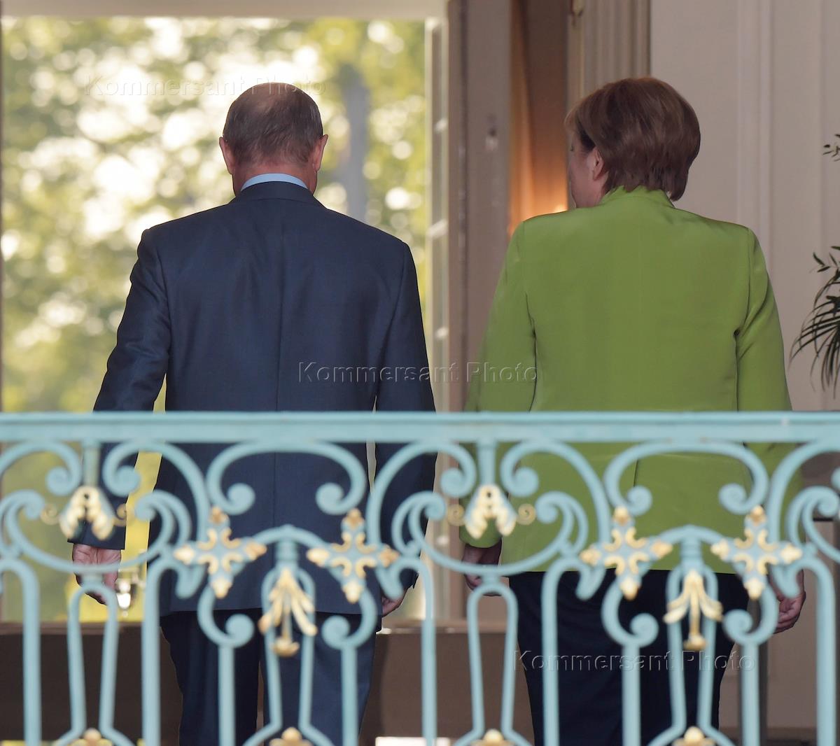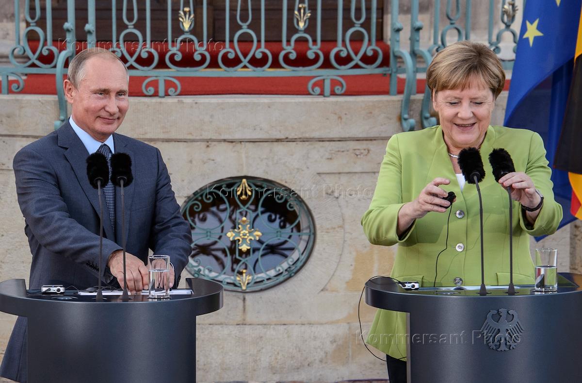 Рабочая поездка президента России Владимира Путина в Германию. Президент России Владимир Путин (справа) и федеральный канцлер Германии Ангела Меркель (слева) во время встречи в резиденции правительства Германии Мезеберг.