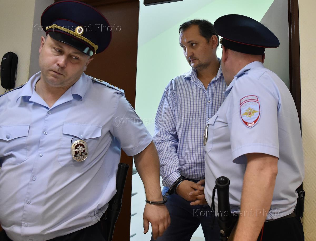 Заместитель генерального директора ракетно-космической корпорации (РКК) "Энергия" Алексей Белобородов (в центре), обвиняемый по делу о мошенничестве, перед началом заседания Бабушкинского районного суда.