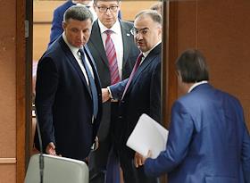 Парламентско-общественные слушания "Совершенствование пенсионного законодательства" в Государственной думе (ГД) России. Министр труда и социальной защиты России Максим Топилин (слева) и статс-секретарь - заместитель министра труда и социальной защиты России Андрей Пудов (второй слева) перед началом слушаний.