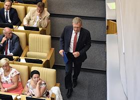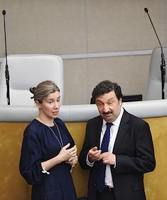 Парламентско-общественные слушания "Совершенствование пенсионного законодательства" в Государственной думе (ГД) России. Ректор Российской академии народного хозяйства и государственной службы РАНХиГС при президенте России Владимир Мау (справа) перед началом слушаний.