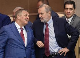 Парламентско-общественные слушания "Совершенствование пенсионного законодательства" в Государственной думе (ГД) России. Первый заместитель председателя комитета ГД России по труду, социальной политике и делам ветеранов Николай Коломейцев (слева) и председатель Фонда социального страхования России Андрей Кигим (в центре) перед началом слушаний.