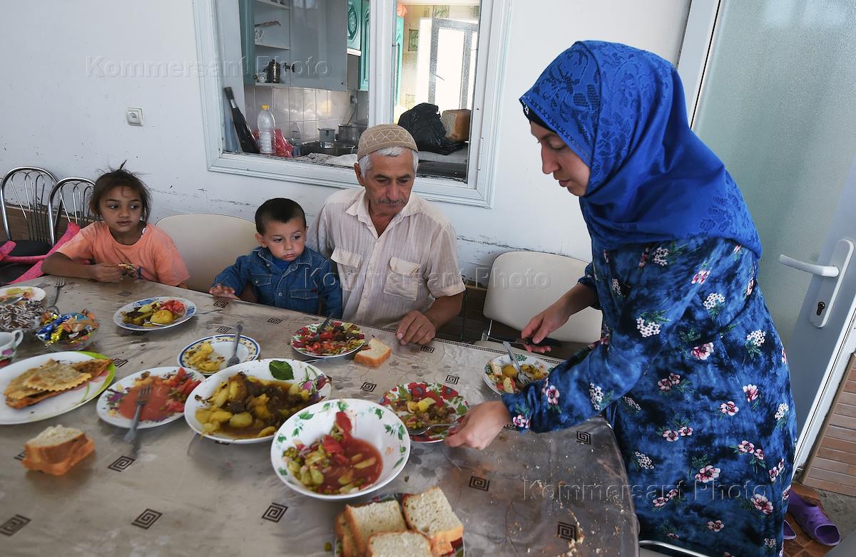 Праздник жертвоприношения Курбан-Байрам. Семья за столом во время праздничного обеда.