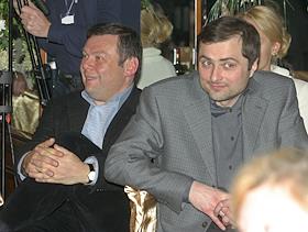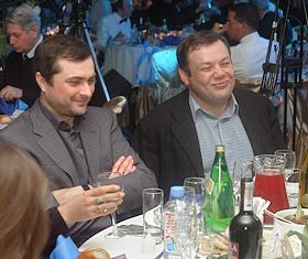 Председатель Совета директоров "Альфа-Групп" Михаил Фридман (справа) и заместитель главы администрации Президента России Владислав Сурков (слева) во время торжественного приема, посвященного празднованию Хануки (Праздник Освящения). Прием прошел в гостинице "Рэдиссон Славянская".